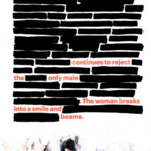 This piece reads: “A woman feeling overwhelmed; continues to reject the only male. The woman breaks into a smile and beams.”
